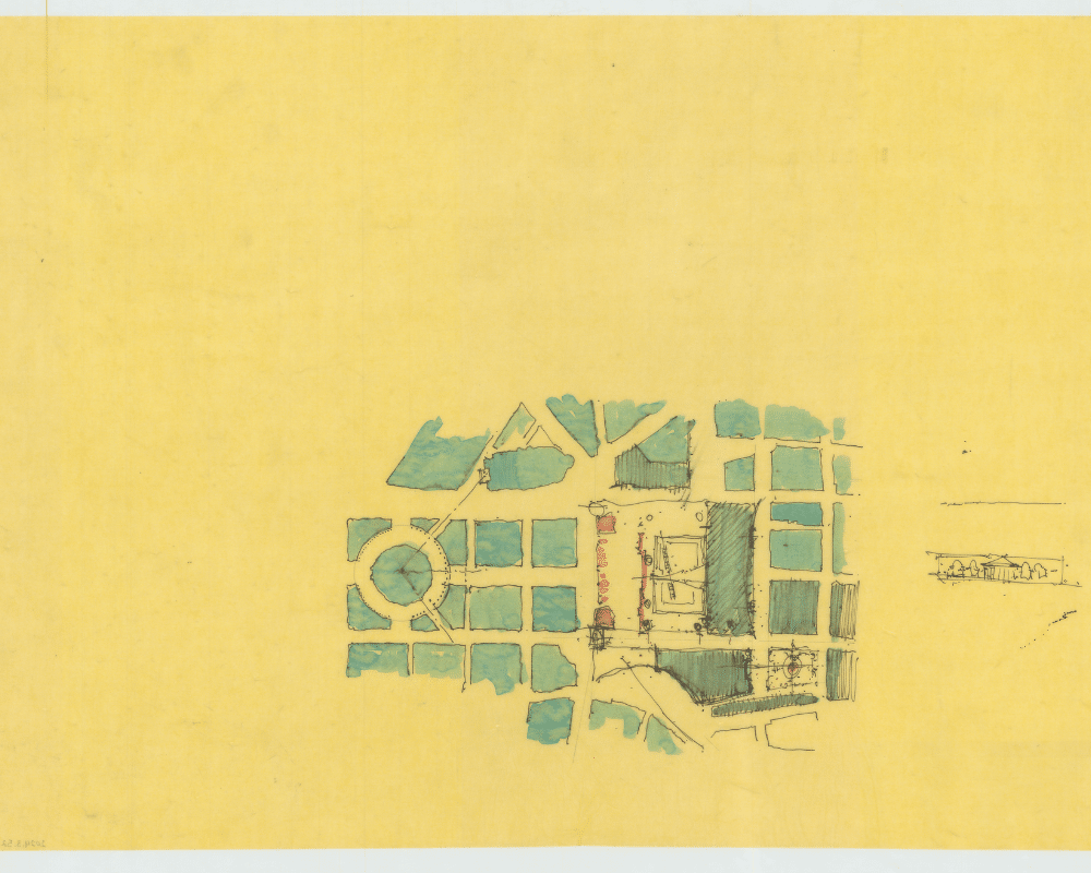 Although this project was never built, comparing the early aerial view sketches with later drafts reveals how the proposal evolved. Some features, like the obelisk in the public square, remained consistent throughout, while the surrounding buildings underwent several changes before settling into their final form. Examining the entire collection offers a rare opportunity to trace the incremental changes that shaped the final design.