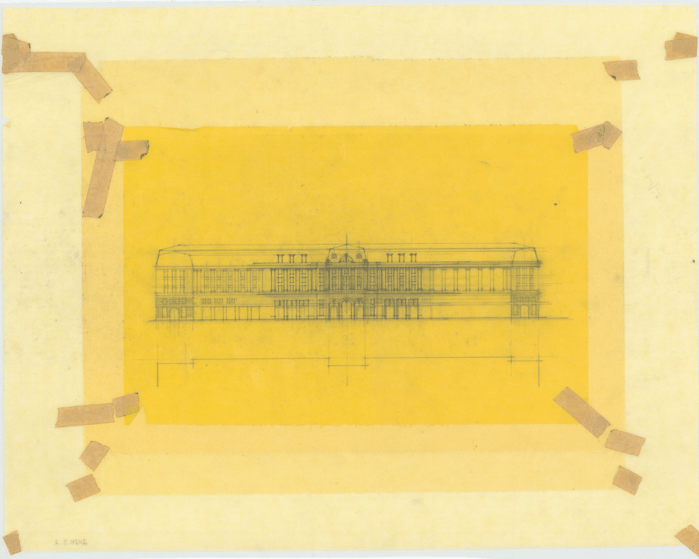 These drawings were completed primarily on drafting paper, also known as tracing paper, which is a thin, translucent material used by architects for its ability to easily layer designs. A few of the pieces in this collection consisted of multiple sheets taped together, combining several elements or additions into a single design draft.