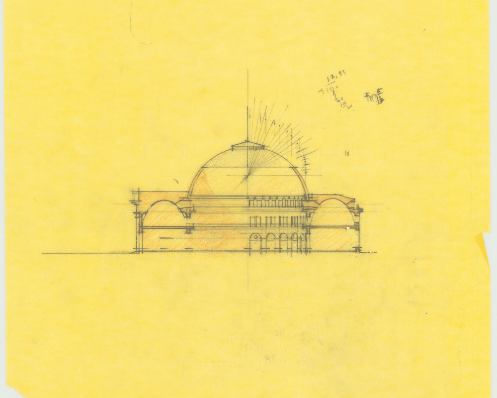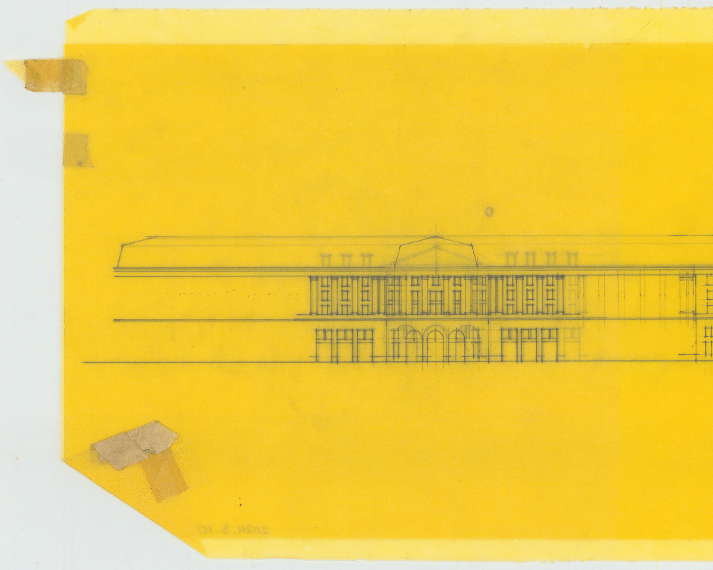 Th Museum’s collection includes a range of materials, from small sketches of building facade details to larger bird’s-eye-view drawings of individual structures and the entire complex. It also features highly detailed renderings prepared for the final project proposal. While most drawings are executed in graphite, as is common in architectural work, some incorporate color, using crayon or colored pencil to shade sections of buildings. A select few are drawn in ink and enhanced with color, possibly applied with watercolor or colored inks.